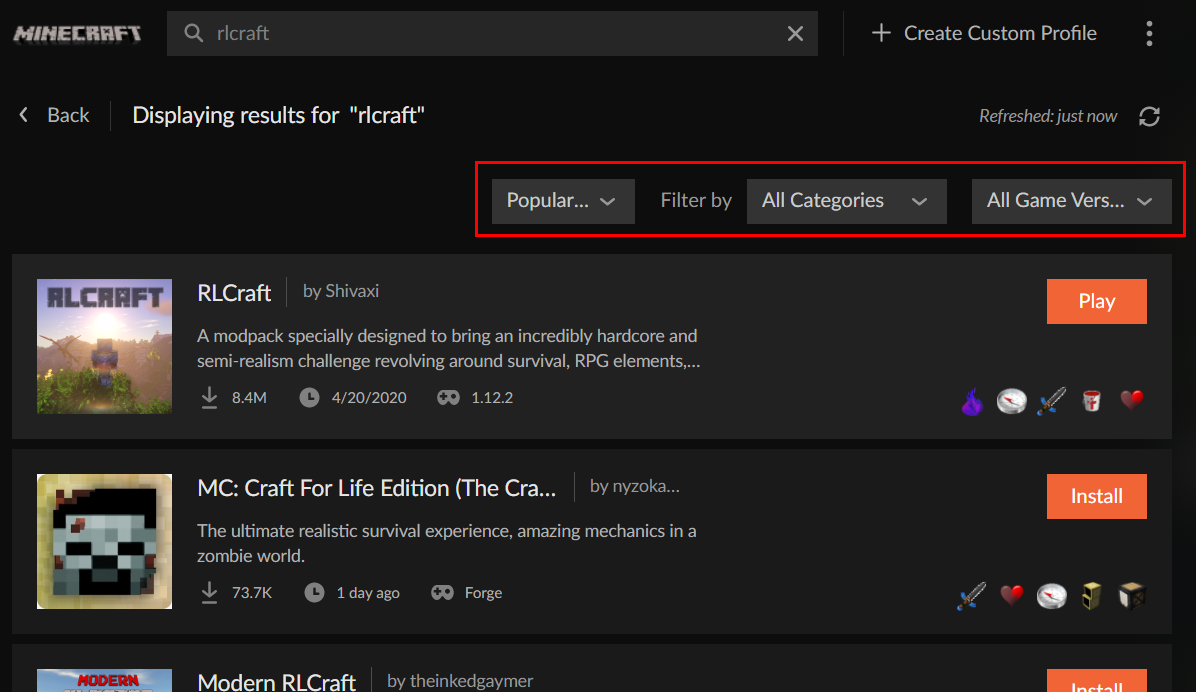 ◆ Browse Modpacks 탭에서 모드팩을 찾을 수 있습니다. 커스포지에서 사용 가능한 모든 모드팩들을 확인 가능합니다. 모드팩들의 정렬 방식을 선택 가능하고 카테고리, 버전별로 필터링 가능합니다. 현지 커스포지에는 76,349개의 모드팩이 등록되어 있습니다. 주황색 Install 버튼을 눌러서 모드팩을 바로 설치할 수 있습니다.