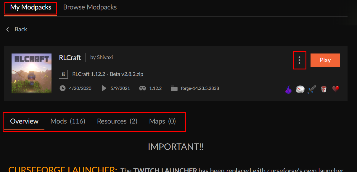◆ My Modpacks 탭에서는 설치된 모드팩을 확인 가능합니다. 설치된 모드팩을 클릭하면 세부 정보를 확인할 수 있습니다. 모드팩의 소개와 모드팩에 포함된 모드들의 목록, 모드팩에 포함된 리소스팩(텍스쳐팩)의 목록, 지도를 확인 가능합니다.