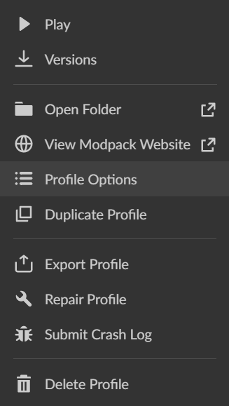 Profile Options - 모드팩의 이름을 변경하거나 포지 버전 선택 등의 간단한 모드 설정 창을 띄웁니다.