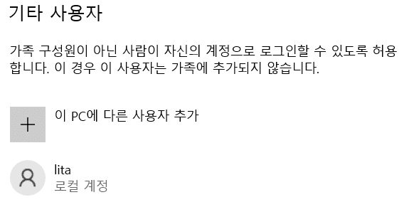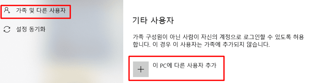 가족 및 다른 사용자 탭 > 기타 사용자 항목에서 이 PC에 다른 사용자 추가 클릭