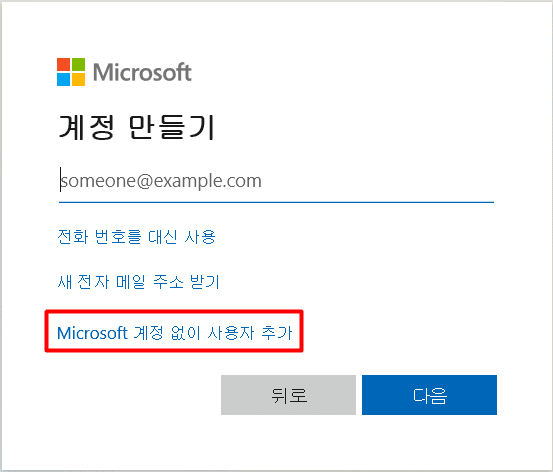 'Microsoft 계정 없이 사용자 추가' 를 눌러주세요.